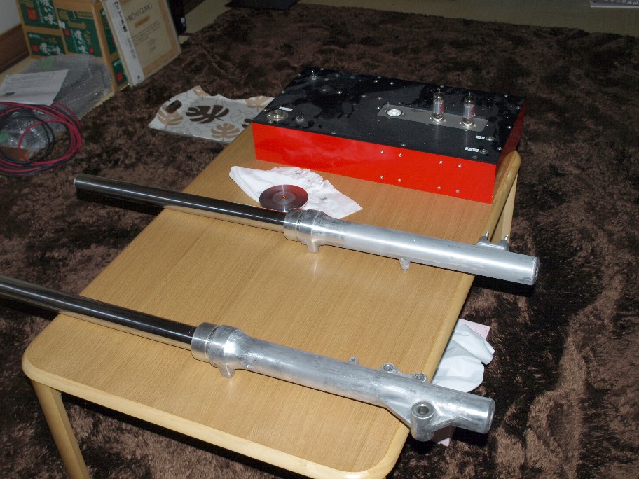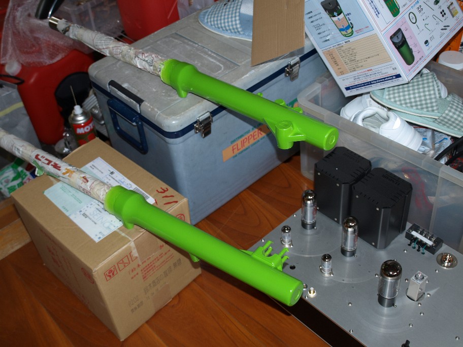工場内の整理がつかないので、フォークを組んでシェルパを出そう。 試聴室で乾燥を行っているフォーク(汗)。 手で触れてみると・・・・・・。 未だ、完全硬化とは言えない。 未だ柔らか味が残っている。 こう成るとジックリ待つしか有りません。 急いで組んで塗膜に傷をつけ再塗装。 なんてしたく有りません。 誰かが言っていました。 『塗装は天気と根気とやる気だ。』って・・・。 当分工場は狭い侭。 VTRも出せないし・・・・・・・。 |