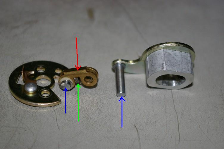 このスプリング、赤矢印のリンク両側の穴に差し込まれている、青矢印のシャフトとのガタを防いでいる物。
