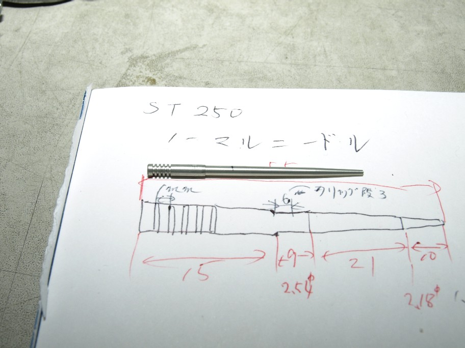 削り終えたニードルとノーマルニードル。どちらが削った方か判りますよね。テーパー部を主に削っています。