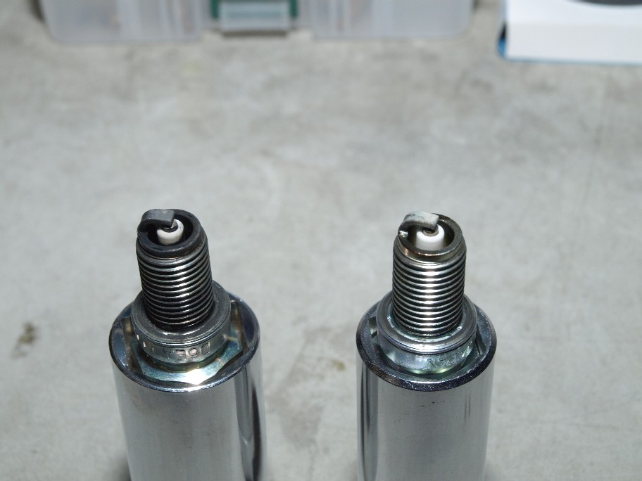 さて、上の写真。プラグの焼けがえらく違います。右は新品同様。左は燻っています。