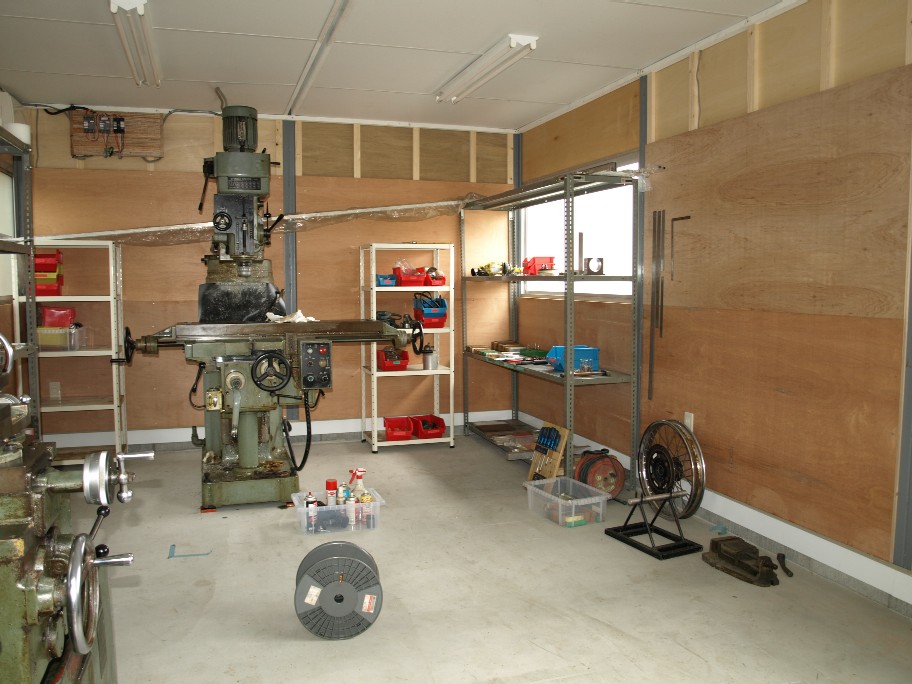 広々です~^^ 壁に工具をイッパイぶら下げて~ 棚に部品を並べて~^^ ワクワク、わくわくです~^^ カメラを取り付けて、作業風景をライブ放送するのもいいかも~^^ で~^^ 秘密基地の名称は~・・?? ○○○ラボのままですか~??