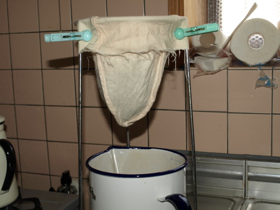 ストロボで照らされたので判り難いですが、ネルの中にはコーヒー豆(勿論挽いたモノ)。