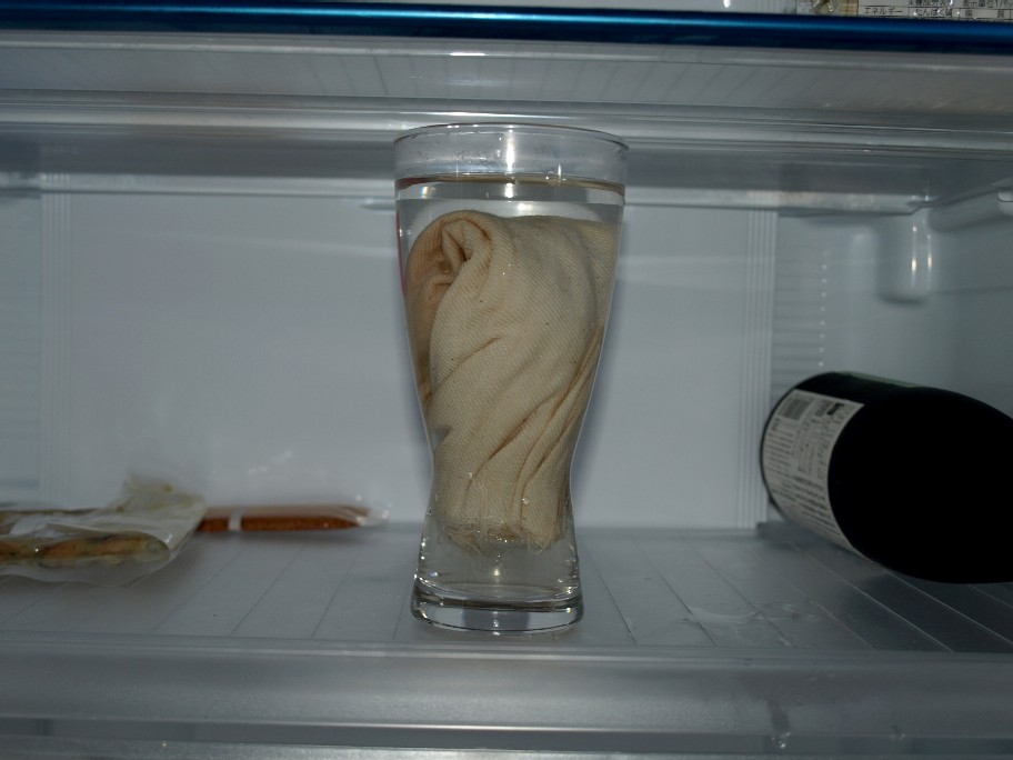 この様にして冷蔵庫の中。絶対に乾かしてはNG。匂いが出ます。