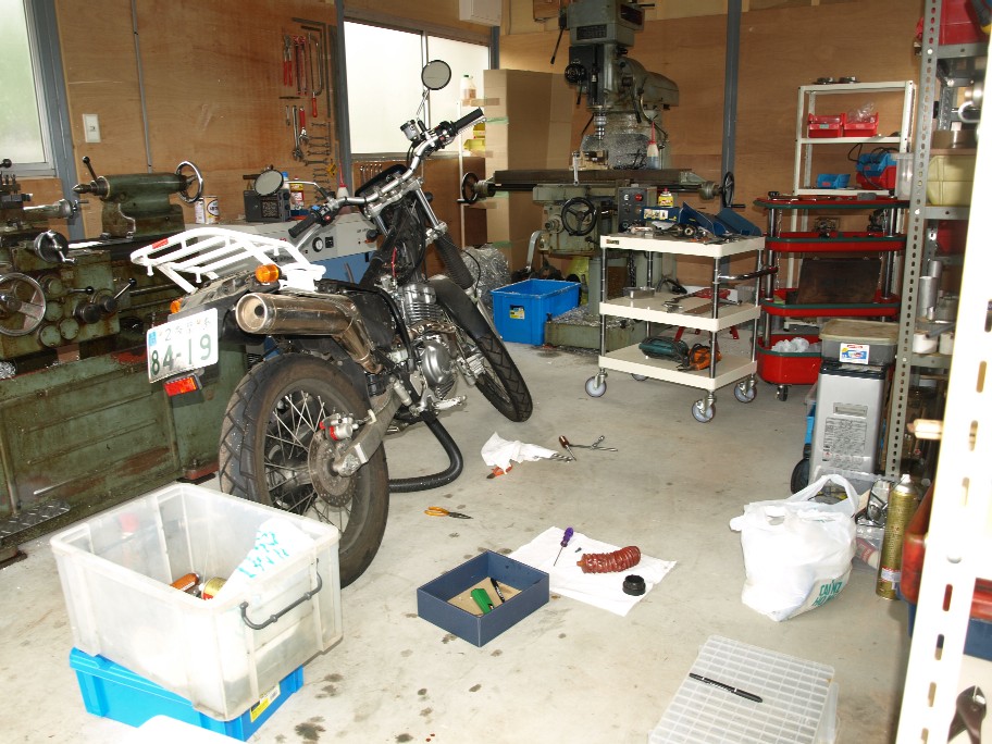 工場の入り口でシートを被っている可哀想なバイクはST君。