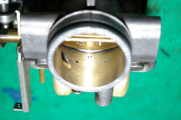 今回、問題視しているのは、この穴の大きさと場所。ミクニの38φと比べますと、キャブの中心点からの外れている距離が大きいですし、穴の大きさもミクニの10倍ほど有ります(ミクニは良く見ないと判らない程小さい)。