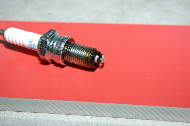 現在のプラグの焼けです。真っ白。デポジットも少々。まあ、ガソリンがチョイ古いかもしれないので、まだ結論は出していません。要するに買った時には略満タン。補給したら2,5㍑しか入らない。で、走行が伸びないので、其れっきり補給はゼロ(なさけなか・・。)。店頭で暫く展示してあった車両ですから、ガスをいつ入れたのかは不明。
