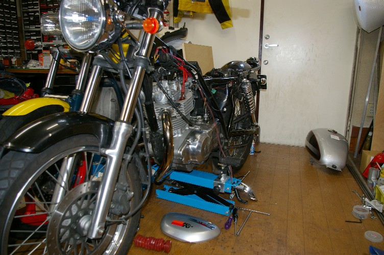 エンジン周りはオイル交換の度にウエスで拭いていましたので、マアマアなんですが、車体周りが・・・・・(汗)。 たった今終わりまして外へ出しました。 街灯でメッキ部分が光って綺麗です。 手に入れてから、1年半。フロントリムはさびの出る一歩手前でした(始めて掃除しました)。 こんな時は『さびとりつや之助』を愛用しています。 さびを取るだけでなく、保護効果も有りますので、インナーチューブ周りにも使っています。 でも兎に角汚れていました・・。