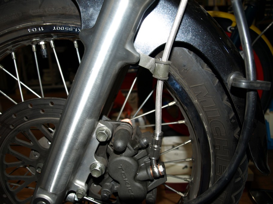 キャリパーから出ているブレーキホース。ゴムと違い硬いので、今迄のステーに付けると、ホースの曲がりがきつく、取り出し部に掛かる応力が心配です。