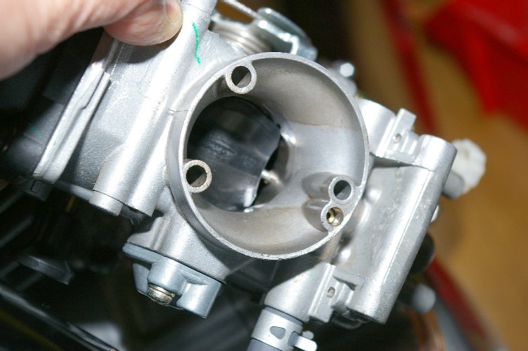 で、何をやっているのかと言うと、パイロットエアージェットを2個取り付け、エンブレ時には1個にしてガスを濃くすると言う仕組みです。問題はエンブレ時に濃いガス(メーカーは適正混合気と言っていますが)が行くと言う事。エンブレ時は回転数に対してスロットルが開いていない。結果必要量の混合気は供給されない。結果実圧縮比は下がってしまう。結果燃焼しづらい。燃焼室の状態は悪くなる。その状態でスロットルを開けると、燃焼室の状態が良く有りませんからスロットルに対するツキが鈍ってくる。という図式を考えました。写真キャブ入り口の下部に有る二つの穴。その内、中に真鍮の色をしているのが常に働いているパイロットエアージェット。キャブサイドのふたの中にエンブレ中は働かなくなるジェットが入っています。2つのジェットを取り外しますと常時使っているジェットの方がはるかに小さい。