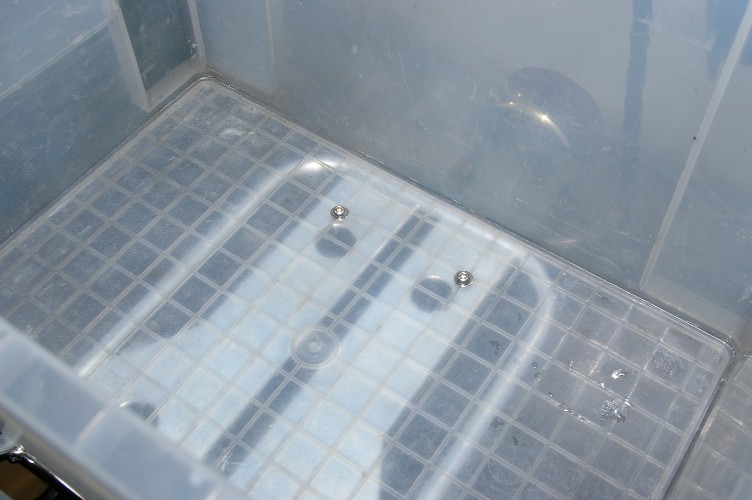 で、キャリアに開いていた穴を利用して、衣装ケースをネジ止めしてしまいました。勿論此れだけではNGですから、単に位置決め用。ゴム紐グルグルと併用です。衣装ケースに拘っている理由は、四角い事。変にアールが付いていると、意外と荷物が入りません。偶然、僕の持っているクーラーBOXが衣装ケースの丁度半分の大きさで、中に入れると誂えた様にピッタシカンカン。残りの半分にカッパやその他の土産が入ります。