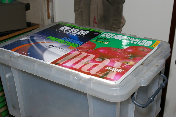 更に衣装ケースの蓋の凹み。愛用の道路地図が2冊ピッタリ。結果、一々ケースを開けないでも地図の確認が簡単。ゴム紐グルグルですから地図は落ちません。勿論一冊でも大丈夫。