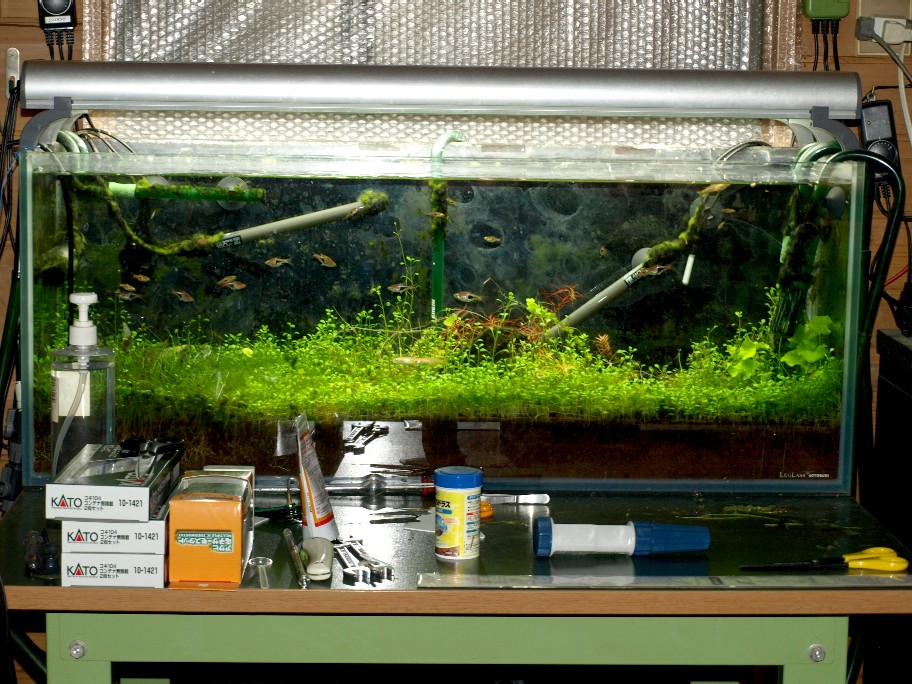 水草の光合成を活発にして、酸素を補給。 結果、フィルターの能力を上げる。 そんな訳で、現在の照明は、T5蛍光管(39W)を4本。それも高輝度管です。 それでもコケの発生は微々たるもの。 水草の気泡の上げ方を見ていると、消灯間近になってから、活発に成ってくる。 水草が酸素の気泡を上げだしたら、水の酸素が飽和状態と思っています。 つまり、その時間に成る迄は、水中の酸素濃度は飽和状態に成っていない。 要するに、水草が作る酸素はフィルターが使ってしまう。 CO2濃度を測って見ると面白い事に、照明点灯時、沢山のCO2添加をしなくても、CO2濃度が上がるんです。 只今の添加量は、1年前から比べると可也少なめ。 連続添加をすると、濃度が上がり過ぎるので、間引きで添加。 で、数日前から始めたのが、酸素飽和状態を出来るだけ長い時間維持したい。 と言う事は、水草が酸素の泡を出し始めてから消灯までの時間を長く。 只今の照明点灯時間は、8:00~17:00。 昔は5~6時間が限界でした。それ以上点灯するとコケの餌食に・・・・。 様子を見ながら、照明の点灯時間。もう少し伸ばしてみます。 最近困った事に、T5管を販売している所が減りました。 日本では需要が無かったんでしょうね。 入手不能になったら、次を考えます |