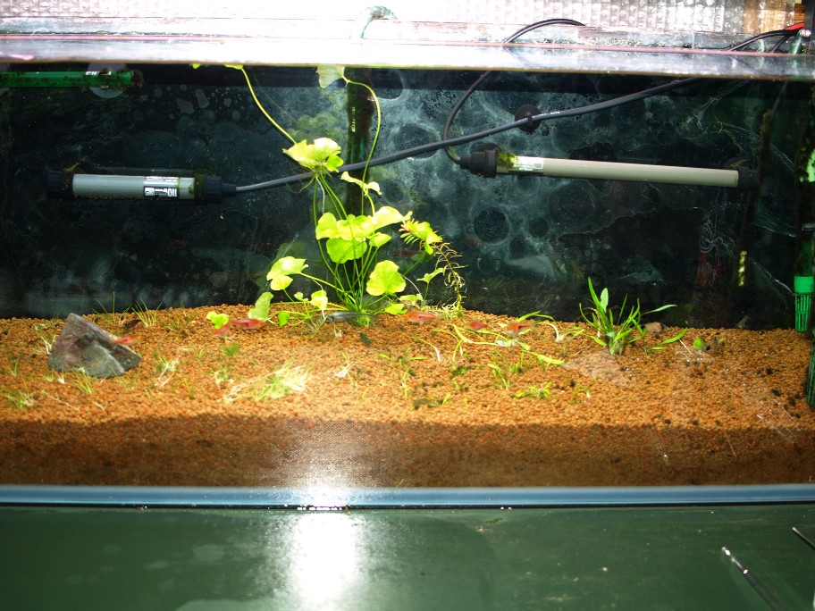 夜中に出来るみたいなんですね。 昼間は、少しずつですが消えて来ます(水面が真っ平らに成る程のしつこい油膜では有りません)。 夜中の酸素不足。と考えたんですね。 とりあえず、エアーレーション(ストーンとホース)の道具も発注しました。 発注と同時に、照明時間を長くしたのです。 要は、消灯時に水草が酸素の泡で包まれている状態にする。 つまり、水草の気泡で夜中の酸素不足を補えれば・・・・。と考えたのです。 此れが成功。昨日の朝は油膜が少ない。 今朝は、殆ど見られない。 巧く行った・・・・。 で、今日、ストーンとホースが入荷・・・・・・・・(使わないよねー)。 |