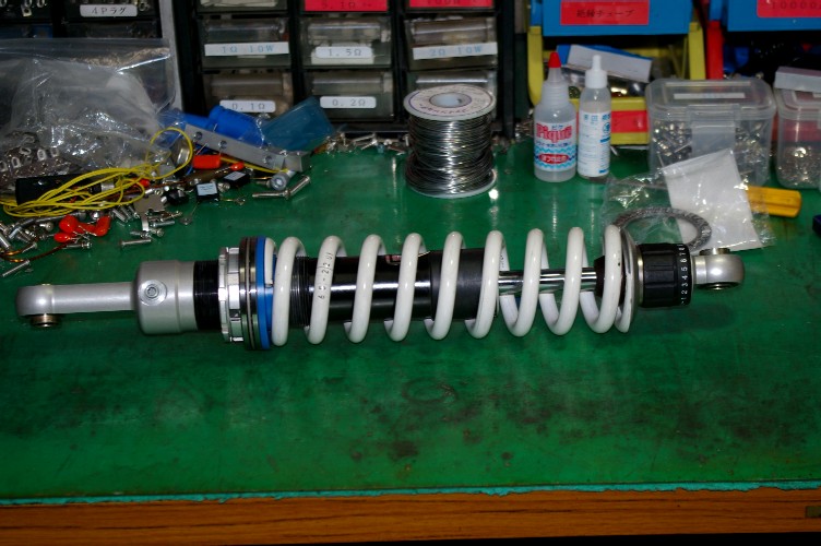 なんせ、作業台の上にWPサスがゴロリ。 拙いよねー。 取り付けますか。 ウーーーーーン。ブルーがお洒落。 正直、STの時は浮いてしまったブルー。 WPの白いスプリングには、よく似合う(僕の欲目)。 昨日辺りから、気温もドンドン上がって来ている。 早く、2号を動くようにしなくちゃ。 |